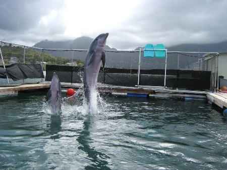 Wenns um Akustik geht, dann sind die Delfine natürlich nicht weit!!! Gestern wurde ich eingeladen mit zu den Außenanlagen der Insel zu fahren, um sie zu trainieren. Darf ich vorstellen, Kina, Boris ,BJ und ihr Junges Hoólono. Drei Delphine und ein „falscher“ Killerwal. Alle vier sehr freundliche, spielfreudige und inspirierende Tiere.