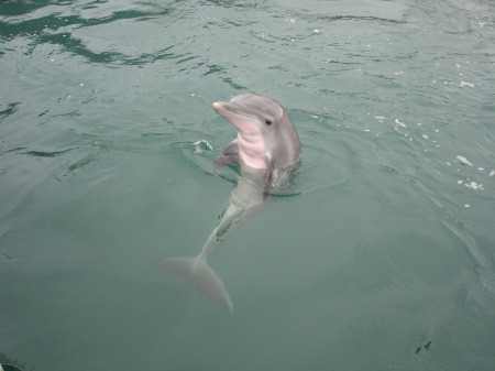 Nun zum eigentlichen Training mit Boris. Er hat ein Eisenproblem und kann nur durch regelmäßiges Blutlassen gesund bzw. am Leben bleiben. Wie aber nimmt man einem 2m langen Delfin wöchentlich das Blut ab? Man nutzt, die für Delfine, unwiderstehlichsten Köder: frischen Fisch! Erst ein bisschen spielen und dann vorsichtig auf den Rücken drehen und an der Schwanzflosse festhalten. So wird er trainiert drei Minuten lang auf dem Rücken zu liegen, dann kurz Luft zu holen, um dann wieder in die Rückenlage zurück zu kehren. Das ganze dauert zehn Minuten!